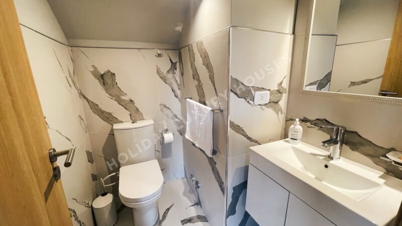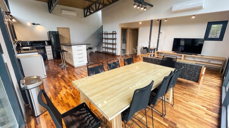 Este espacio combina comodidad y funcionalidad, con una mesa para 8 personas, TV, escritorio, y una isla desayunadora. La cocina está completamente equipada con heladera, horno eléctrico, microondas, lava vajilla y todos los utensilios necesarios para que prepares deliciosas comidas en compañía. Toilette.