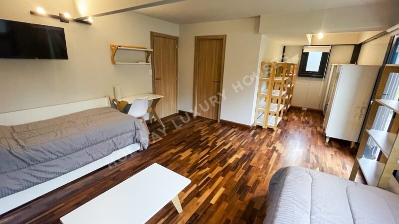 Un versátil playroom con dos camas individuales y dos camas adicionales con carros, sumando un total de 4 colchones. Equipado con TV y escritorio, es un espacio perfecto para relajarse o trabajar en un ambiente acogedor. Baño en suite, vestidor y salida al jardín.