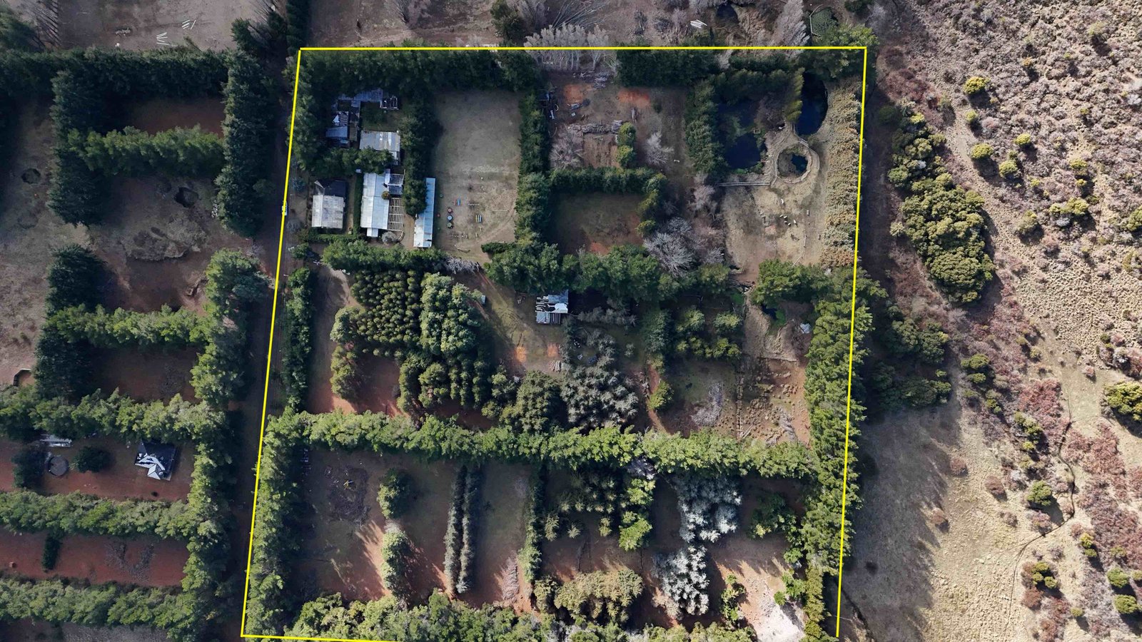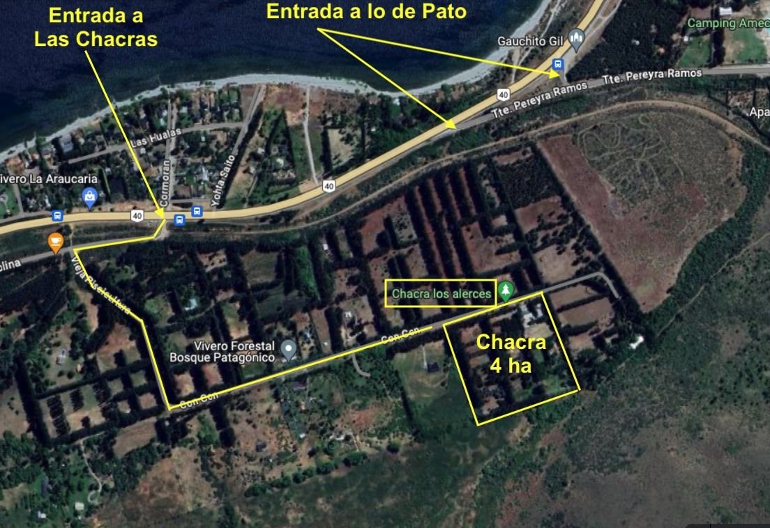 A pocos minutos del centro de Bariloche, en un entorno típicamente rural, con frente a calle Con Con, orientación Norte, calle sin salida de Barrio Las Chacras, se encuentra esta fracción de 4 hectáreas sembradas con pinos de mas de 30 años que la dividen en cuadros aptos para agricultura.